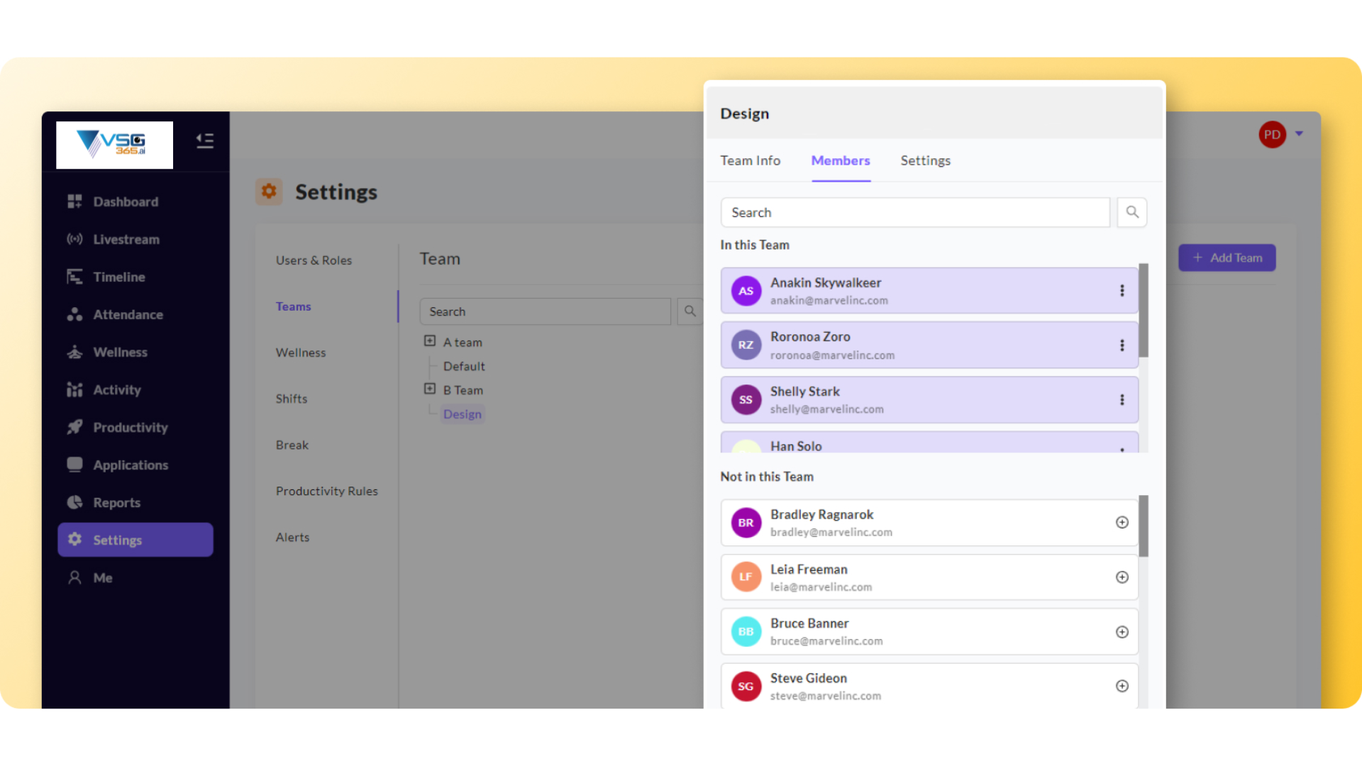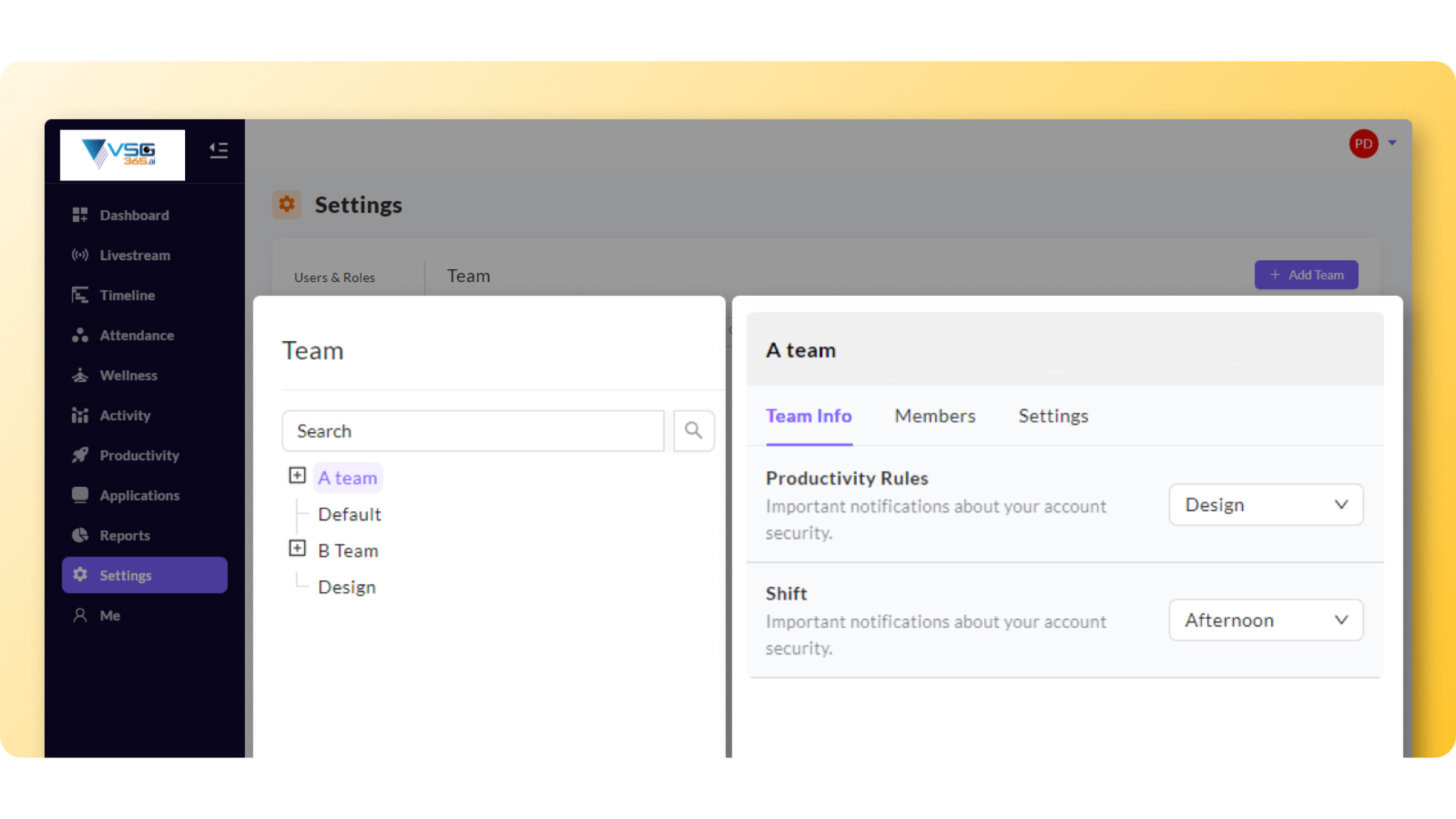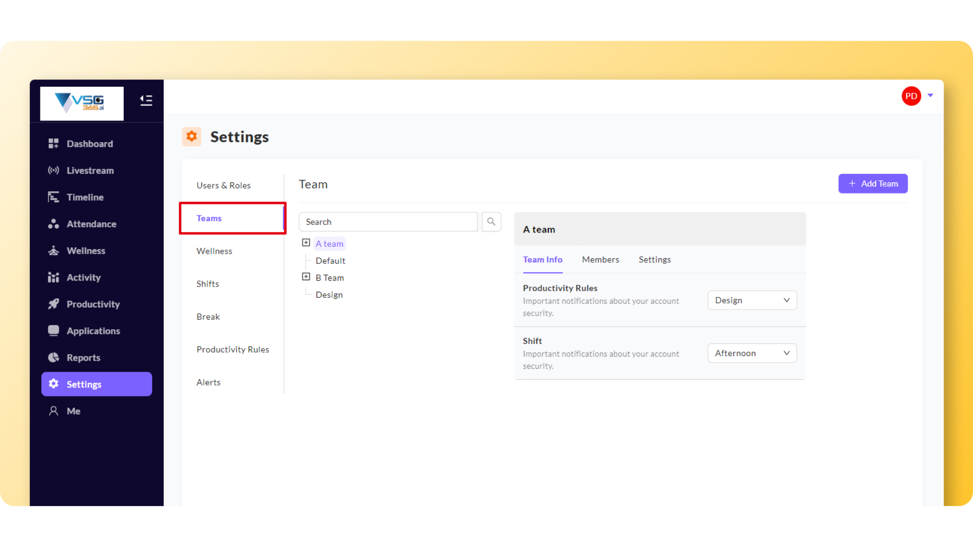 Team Info - You can set the productivity rules policy by selecting the policy for the particular team. You can also set the shift by selecting it from the dropdown.