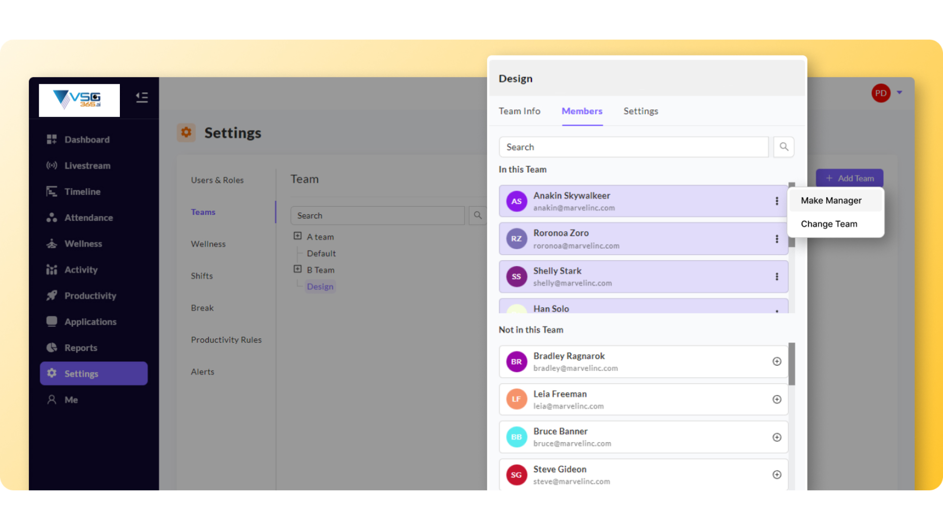 Managers - In the Members tab, click on the kebab icon ( ⋮ ) of the member whom you want to make a manager, and you will find "Make Manager" and "Change Team" in the dropdown menu.