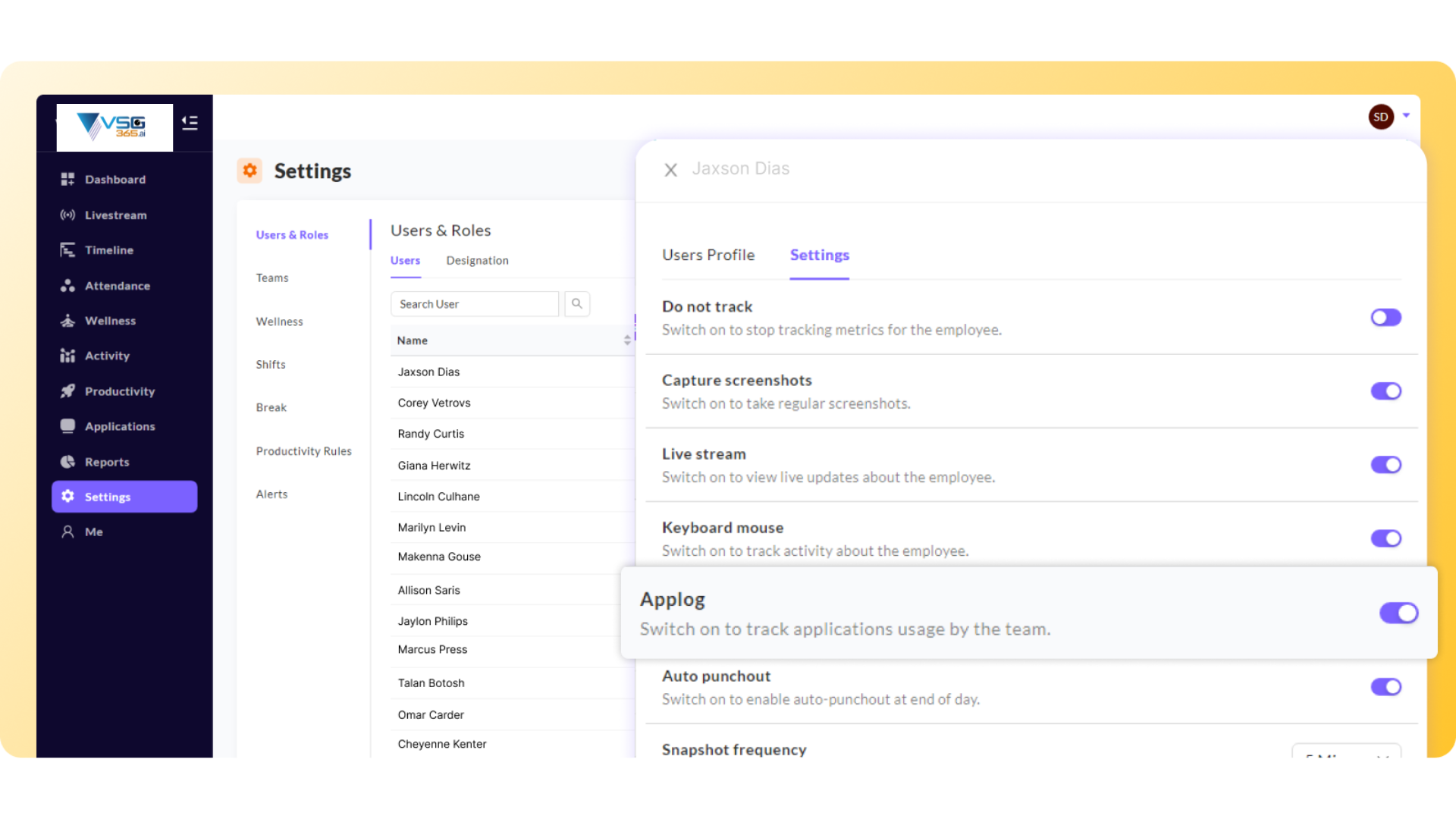 Screenshot Frequency: Set the frequency in minutes at which screenshots will be taken. This filter works by default as per the team’s settings.