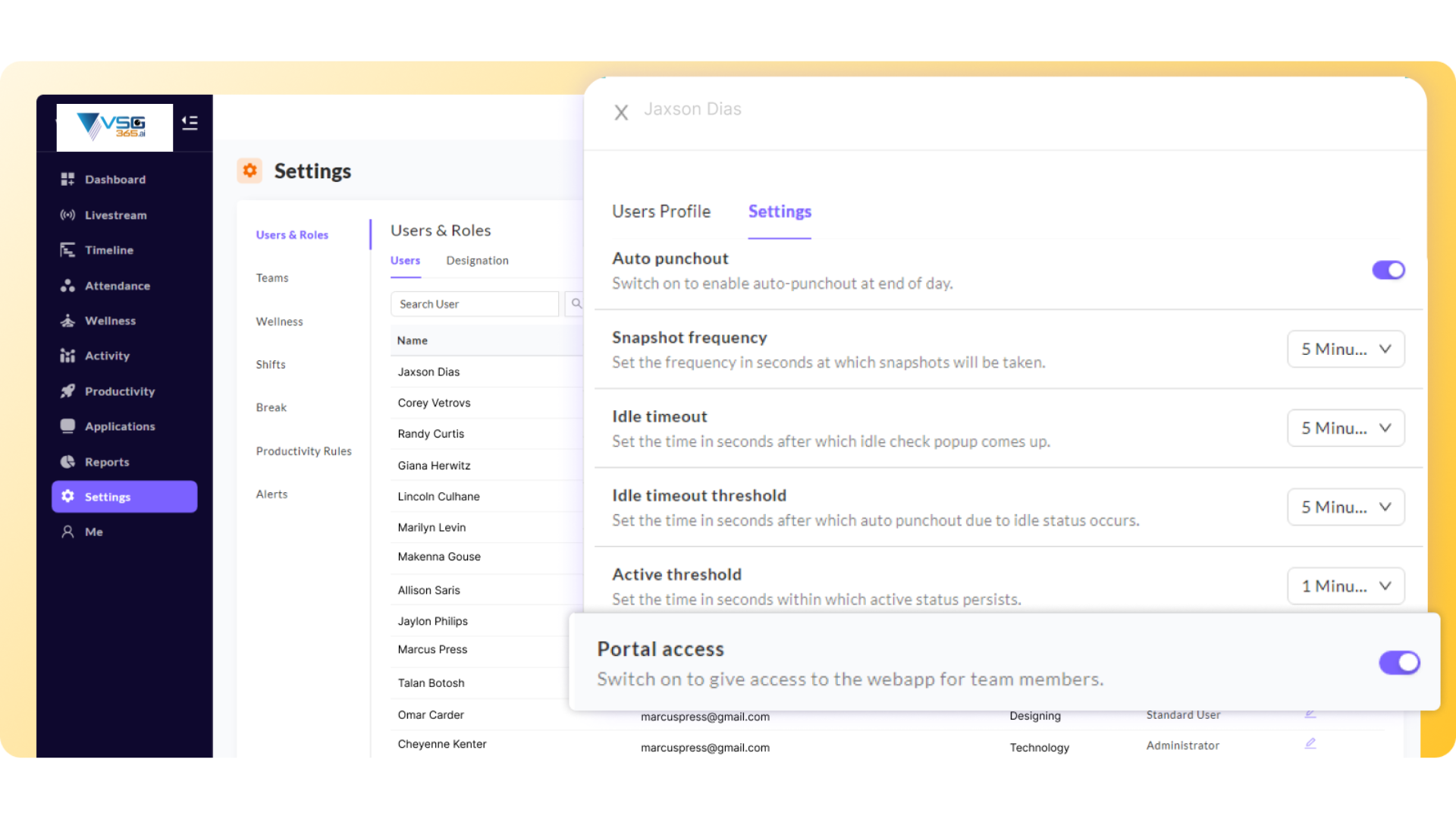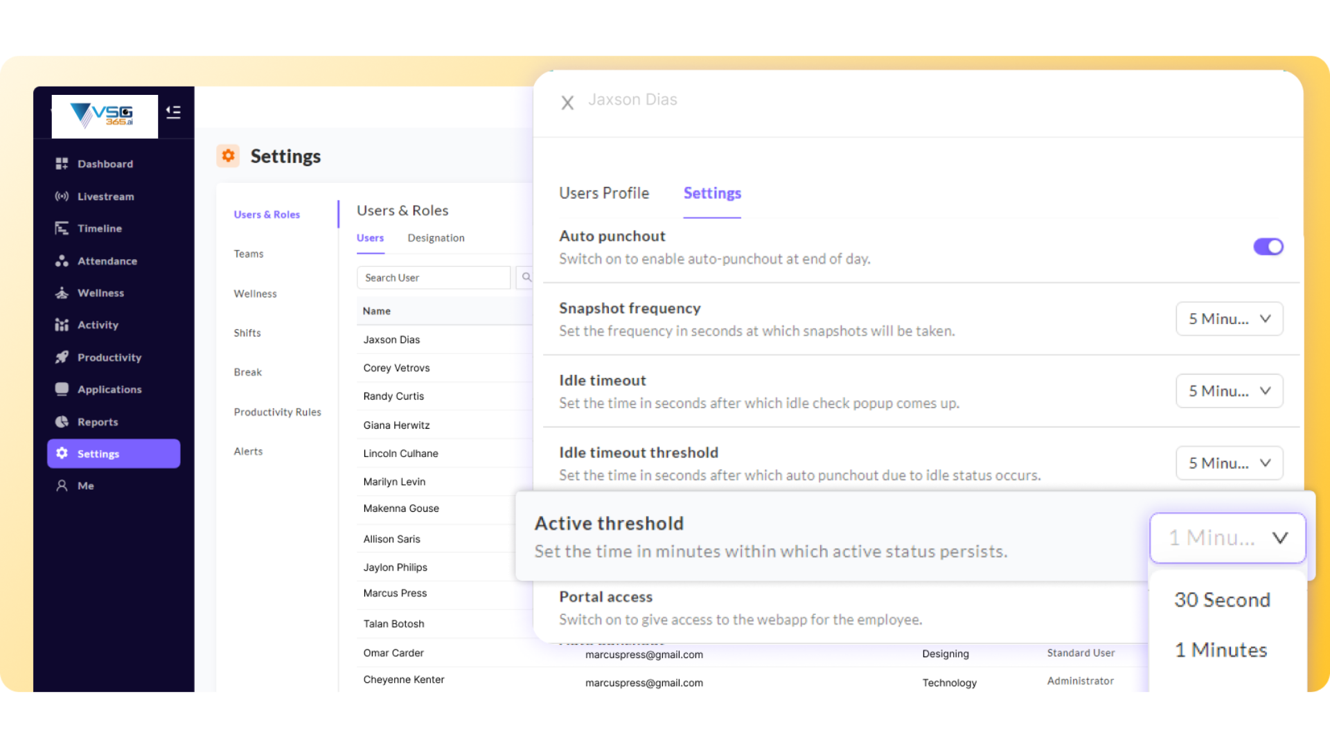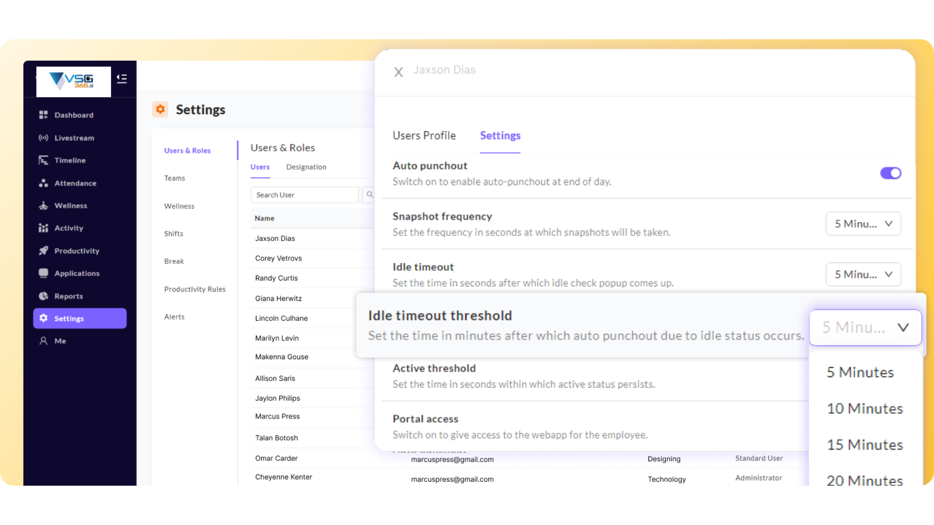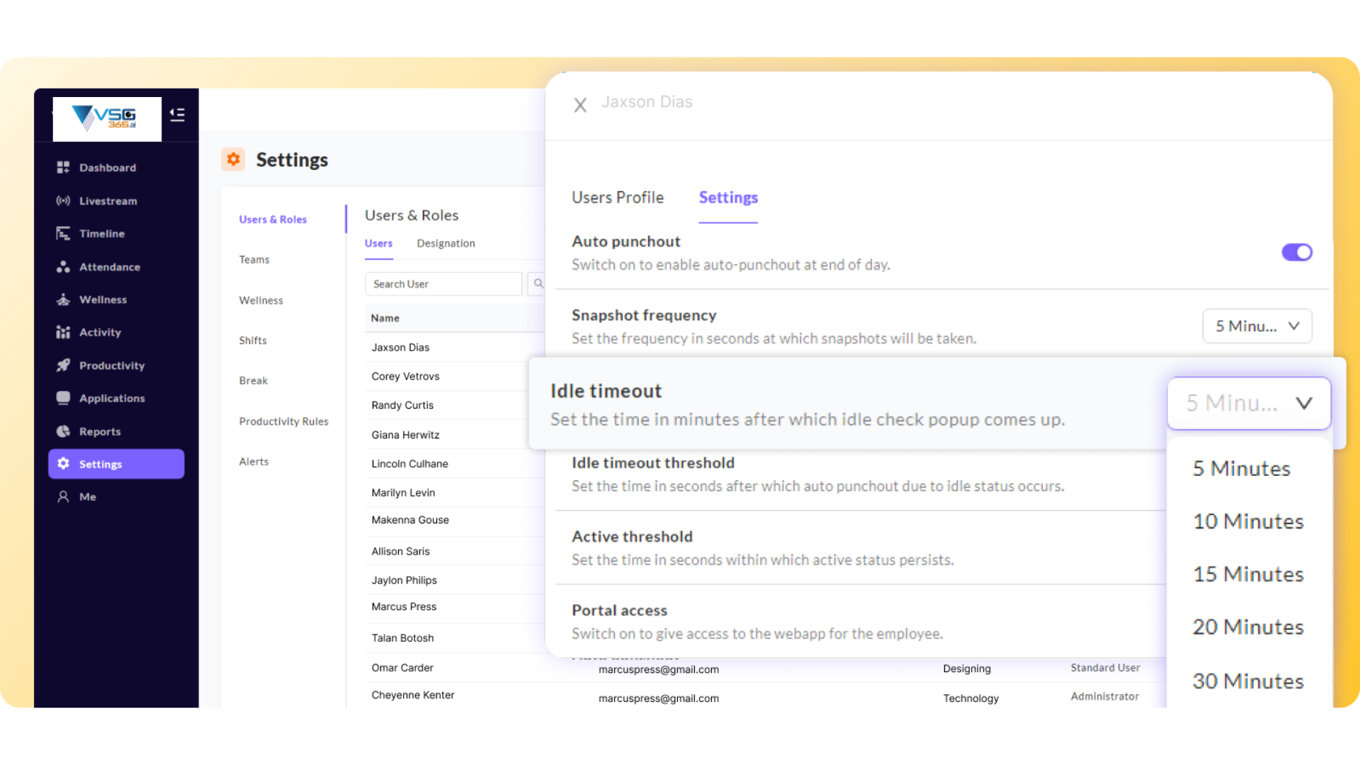 Idle Timeout: Set the time in minutes, after which an idle check pop-up appears. This filter works by default as per the team’s settings.