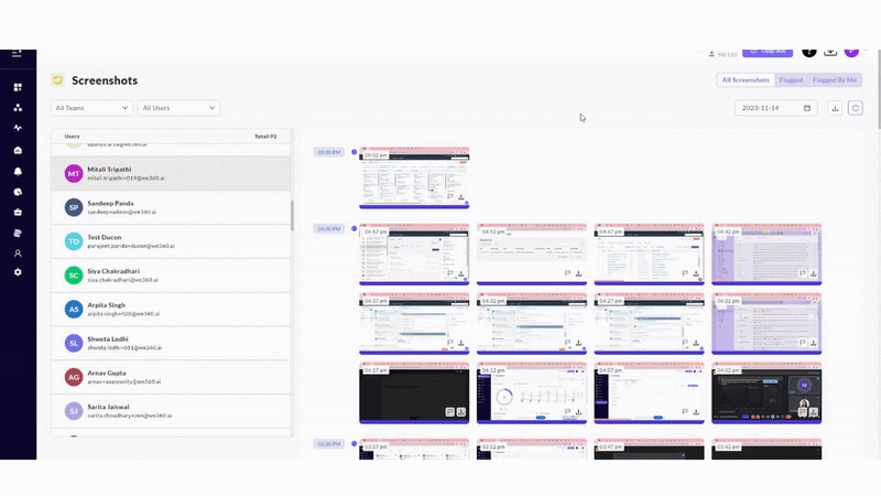 The Screenshots dashboard is divided into two sections: the left side (Users list) and the right side (grids of screenshots). On the left, there is a list of employees, allowing users to select the specific user for whom they want to view screenshots. On the right, a grid of screenshots for the selected date appears. Each screenshot thumbnail includes a timestamp, activity level, flag, and download button, enabling users to gauge the employee's activity level, providing tangible proof of their work.
